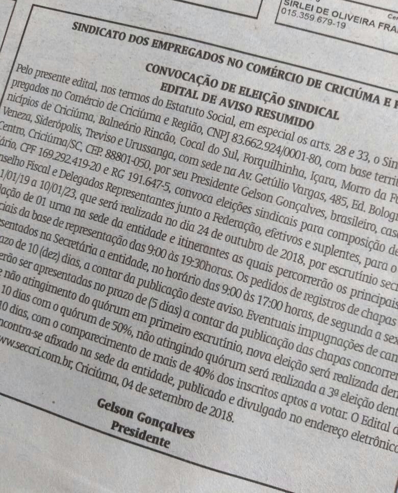 Pelo presente edital, nos termos do Estatuto Social, em especial os arts. 28 e 33, o Sindicato dos Empregados no Comércio de Criciúma e Região, CNPJ 83.662.924/0001-80, com base territorial nos municípios de Criciúma, Balneário Rincão, Cocal do Sul, Forquilhinha, Içara, Morro da Fumaça, Nova Veneza, Siderópolis, Treviso e Urussanga, com sede na Av. Getúlio Vargas, 485, Ed. Bologna, 5º andar, Centro, Criciúma/SC, CEP. 88801-050, por seu Presidente Gelson Gonçalves, brasileiro, casado, comerciário, CPF 169.292.419-20 e RG 191.647-5, convoca eleições sindicais para composição de Diretoria, Conselho Fiscal e Delegados Representantes junto a Federação, efetivos e suplentes, para o mandato de 11/01/19 a 10/01/23, que será realizada no dia 24 de outubro de 2018, por escrutínio secreto, com instalação de 01 urna na sede da entidade e itinerantes as quais percorrerão os principais pontos comerciais da base de representação das 9:00 às 19:30horas. Os pedidos de registros de chapas devem ser apresentados na Secretária a entidade, no horário das 9:00 às 17:00 horas, de segunda a sexta feira, no prazo de 10 (dez) dias, a contar da publicação deste aviso. Eventuais impugnações de candidaturas deverão ser apresentadas no prazo de (5 dias) a contar da publicação das chapas concorrentes. Em caso de não atingimento do quórum em primeiro escrutínio, nova eleição será realizada dentro do prazo de 10 dias com o quórum de 50%, não atingindo quórum será realizada a 3ª eleição dentro do prazo de 10 dias, com o comparecimento de mais de 40% dos inscritos aptos a votar. O Edital de convocação encontra-se afixado na sede da entidade, publicado e divulgado no endereço eletrônico da entidade. Criciúma, 04 de setembro de 2018.