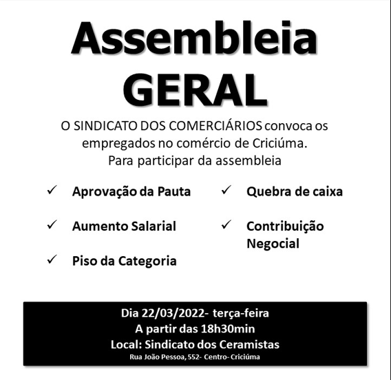 SINDICATO DOS EMPREGADOS NO COMÉRCIO DE CRICIÚMA E REGIÃO EDITAL DE PUBLICAÇÃO DE CHAPA INSCRITA Aos três dias do mês de novembro do ano de dois mil e vinte e dois, às dezessete horas e quinze minutos, na sede do Sindicato do Sindicato dos Empregados no Comércio de Criciúma e Região, sito […]